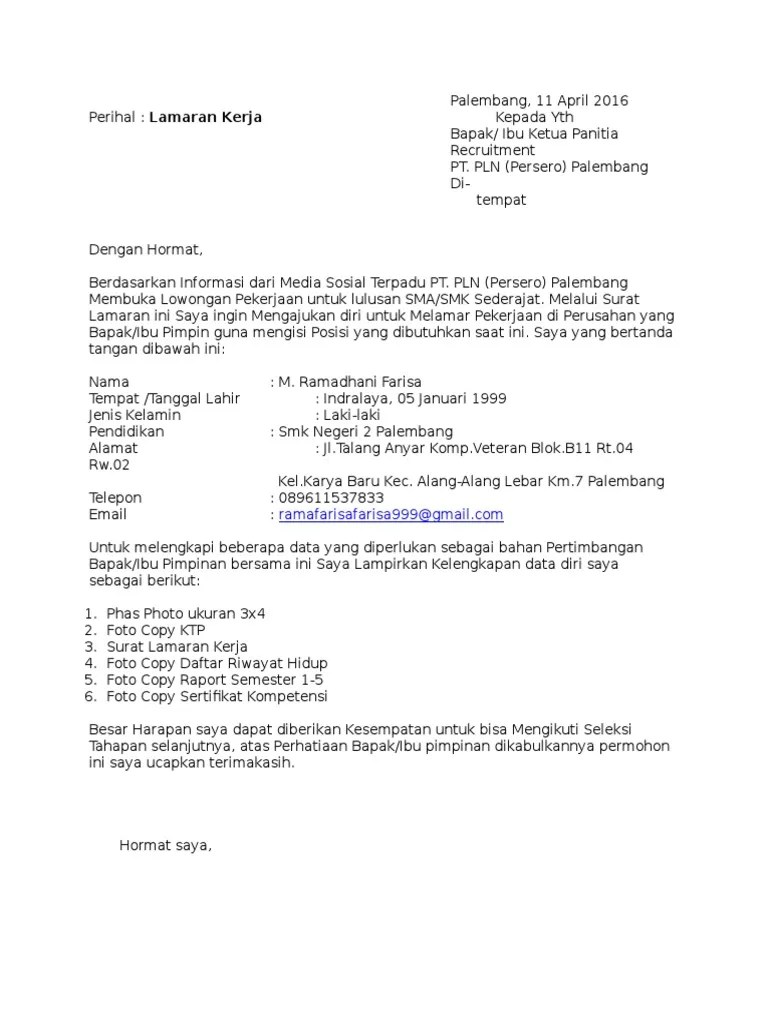 Contoh surat lamaran kerja pt pln persero yang baik dan benar.